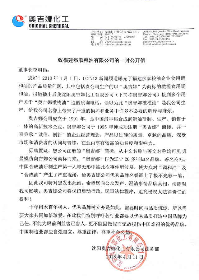 鑒于此事件對沈陽奧吉娜品牌的名譽(yù)損傷,我們特發(fā)公開信,以澄清:沈陽“奧吉娜”非福建“奧吉娜” “合成油”非“調(diào)和油”,并呼吁各行業(yè):品牌從無到有、從小到大、從大到強(qiáng),其過程的艱辛就如同培養(yǎng)出一個(gè)出類拔萃的優(yōu)秀孩子,“中國質(zhì)造”的新時(shí)代不能再靠傍大款蹭名牌投機(jī)取巧追名逐利,需要用心創(chuàng)新、用智鑄質(zhì)才能真正打造名滿天下長盛不衰專業(yè)品牌,這樣的企業(yè)方能做到茁壯成長基業(yè)長青。