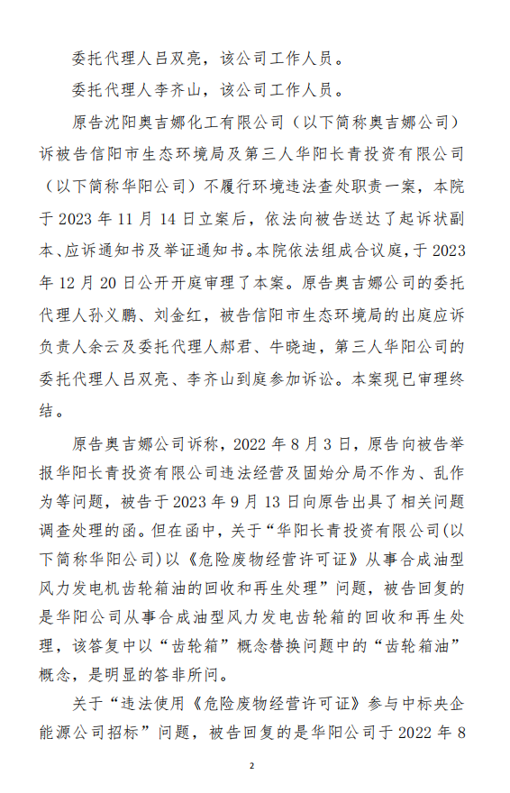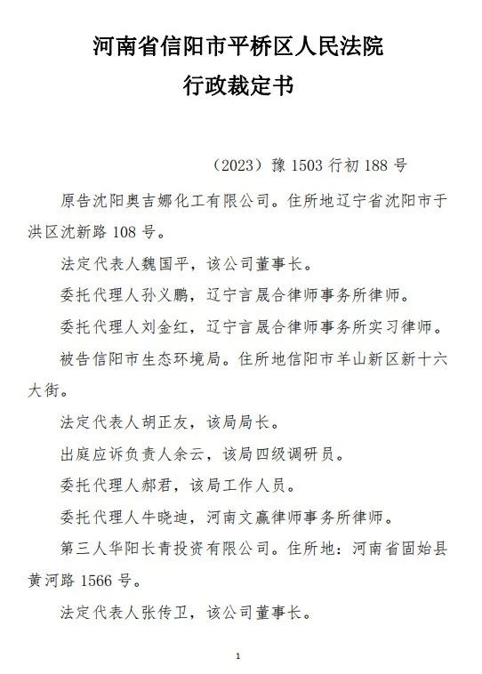 中國風(fēng)電潤滑油民營企業(yè)沈陽奧吉娜化工有限公司(下簡稱:奧吉娜公司或原告)訴信陽市生態(tài)環(huán)境局(被告)和第三人華陽長青投資有限公司(下簡稱:華陽長青公司)行政訴訟案,河南省信陽市平橋區(qū)人民法院于2023年12月29日作出行政裁定:駁回原告沈陽奧吉娜化工有限公司的起訴。