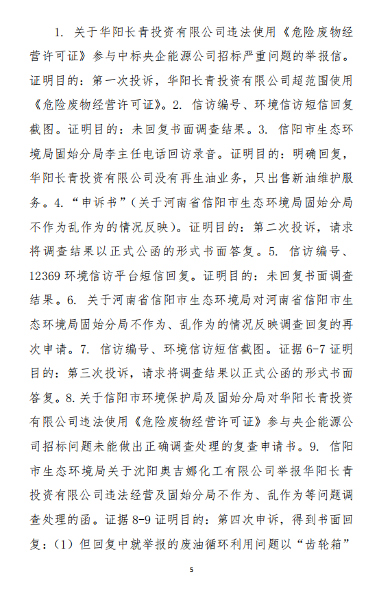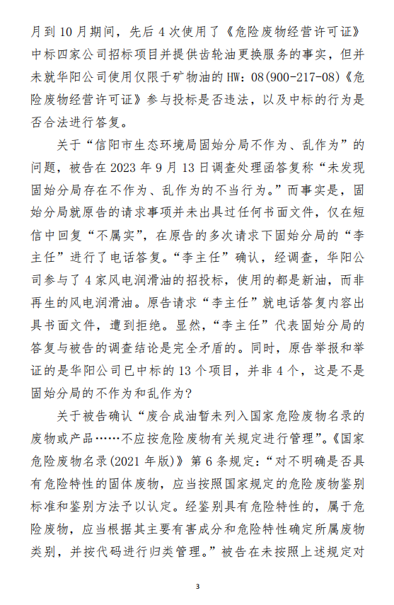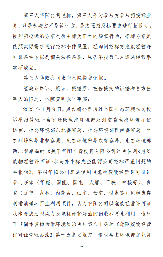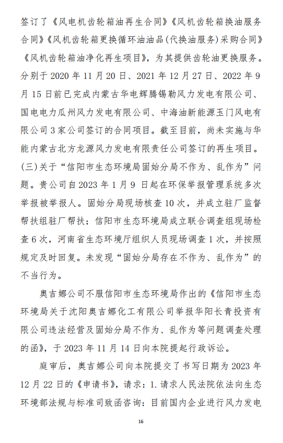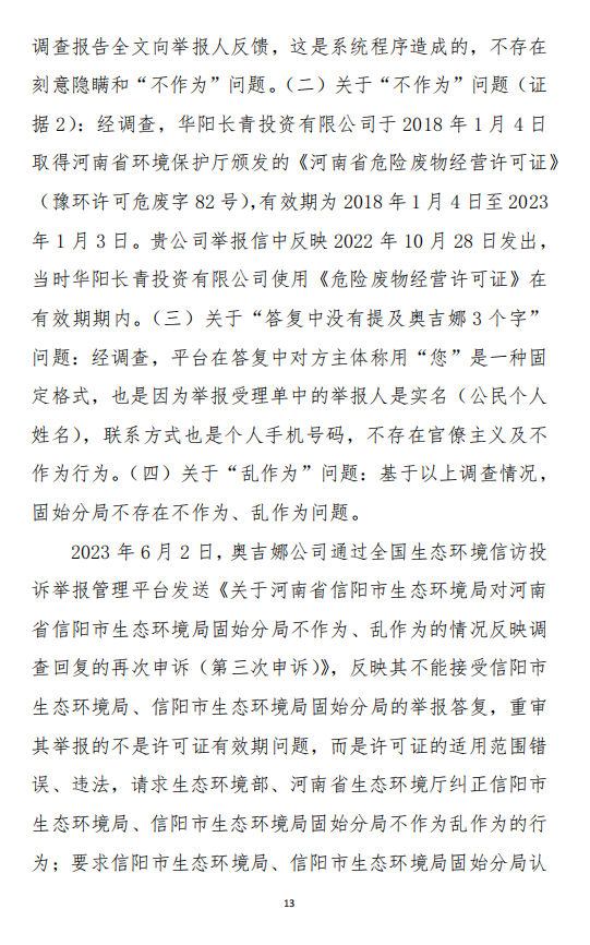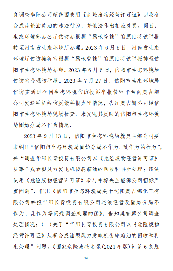 2023年9月13日,信陽環(huán)境局向奧吉娜公司致《信陽市生態(tài)環(huán)境局關(guān)于沈陽奧吉娜化工有限公司舉報華陽長青投資有限公司違法經(jīng)營及固始分局不作為、亂作為等問題調(diào)查處理的函》。函中:一是,以“齒輪箱”替換“齒輪箱油”,偷換概念;二是,做出了廢風(fēng)電合成(齒輪)油不屬于危險廢物的結(jié)論;三是,未發(fā)現(xiàn)固始分局存在不作為、亂作為的不當(dāng)行為。再次否定奧吉娜公司的舉報和投訴。