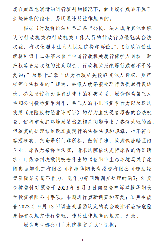 2023年10月18日,奧吉娜公司依據(jù)《行政訴訟法》和《行政訴訟法解釋》,將信陽市環(huán)境局和第三人華陽長青公司訴至信陽市平橋區(qū)人民法院,請求法院:1、判決撤銷被告作出的《信陽市生態(tài)環(huán)境局關(guān)于沈陽奧吉娜化工有限公司舉報華陽長青投資有限公司違法經(jīng)營及固始分局不作為、亂作為等問題調(diào)查處理的函》;2、責(zé)令被告針對原告于2023年8月3日向被告申訴舉報華陽長青投資有限公司事項(xiàng),限期進(jìn)行重新調(diào)查和答復(fù);3、請求人民法院判令被告2023年9月13日調(diào)查處理函認(rèn)定的廢合成油不應(yīng)按危險廢物有關(guān)規(guī)定進(jìn)行管理,違反法律規(guī)章的規(guī)定,無效。