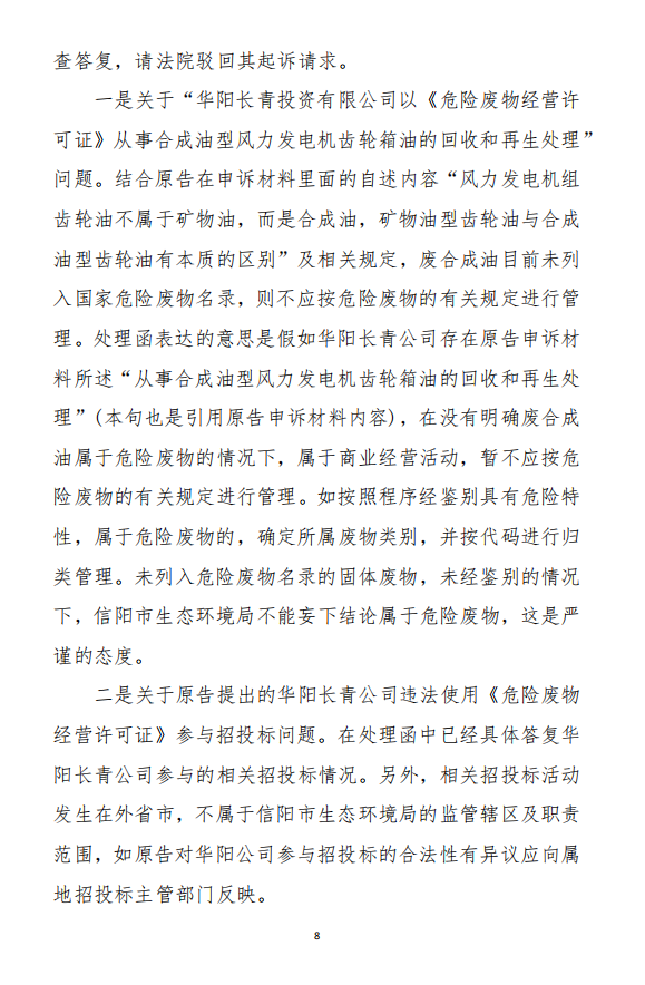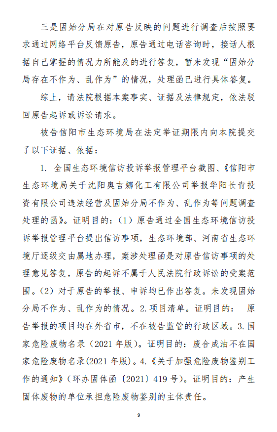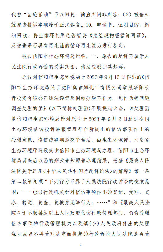 2、訴訟請求:請求人民法院判決撤銷被告作出的《信陽市生態(tài)環(huán)境局關(guān)于沈陽奧吉娜化工有限公司舉報華陽長青投資有限公司違法經(jīng)營及固始分局不作為、亂作為等問題調(diào)查處理的函》;責(zé)令被告對原告向被告舉報華陽長青投資有限公司事項(xiàng),限期進(jìn)行重新調(diào)查和答復(fù);判令被告認(rèn)定的廢合成油不應(yīng)按危險廢物有關(guān)規(guī)定進(jìn)行管理違反法律規(guī)章規(guī)定,無效。