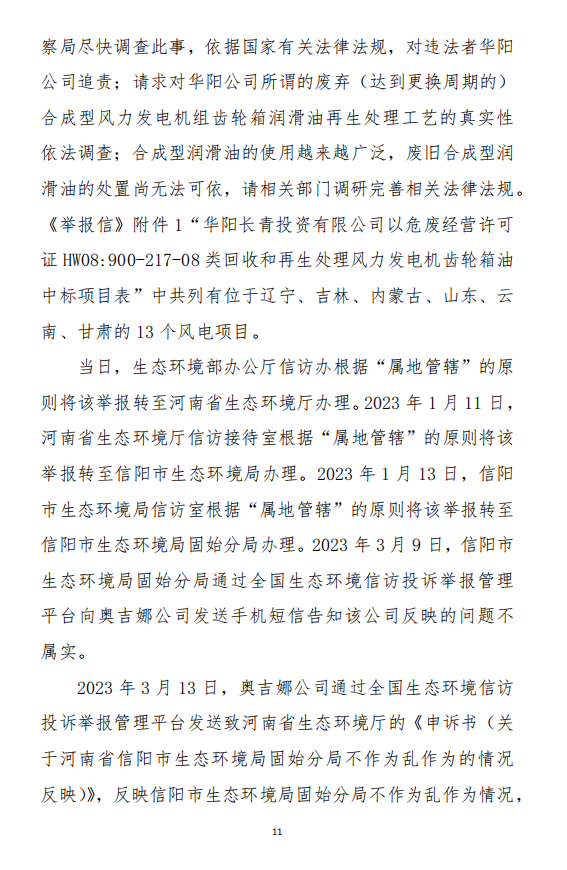2023年3月9日,奧吉娜公司收到固始分局通過12369環(huán)境信訪平臺的短信答復(fù):“反映問題不屬實(shí)”。3月10日,奧吉娜公司向固始分局負(fù)責(zé)人電話詢問,其解釋稱:經(jīng)調(diào)查核實(shí),華陽長青公司沒有再生風(fēng)電潤滑油銷售,出售的是新油。否定了奧吉娜公司的舉報內(nèi)容。對此,奧吉娜公司表示強(qiáng)烈不滿。3月11日,奧吉娜公司向環(huán)境部投訴固始分局的不作為和亂作為。