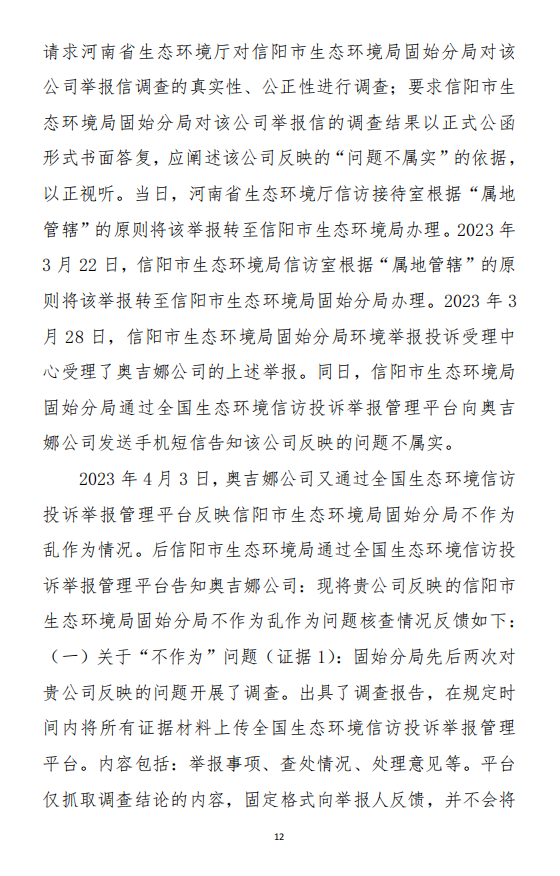 2023年8月3日,奧吉娜公司向河南省生態(tài)環(huán)境廳(以下稱:環(huán)境廳)舉報信陽環(huán)境局包庇固始分局的行為。環(huán)境廳對此高度重視,有關(guān)處長和奧吉娜公司負(fù)責(zé)人進(jìn)行了面談。