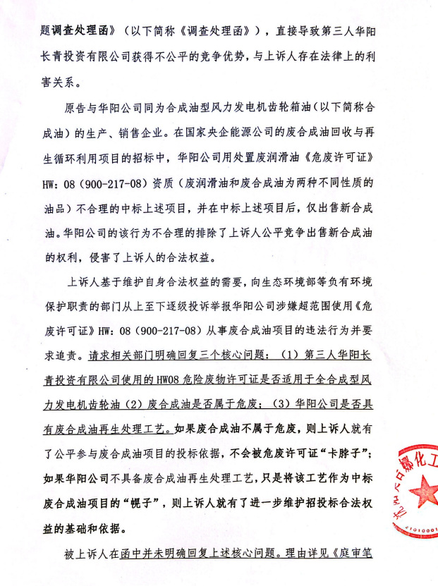 第三人華陽長青公司涉嫌非法使用《危險廢物許可證》,中標(biāo)國家央企能源公司的廢合成油回收與再生循環(huán)利用項(xiàng)目,并在中標(biāo)后僅出售新合成油,而導(dǎo)致出售新合成油的原告未中標(biāo)?;诰S護(hù)自身合法權(quán)益的需要,原告向生態(tài)環(huán)境部等負(fù)有環(huán)境保護(hù)職責(zé)的部門投訴舉報華陽長青公司的違法行為并要求追責(zé)。依據(jù)屬地管理的原則,舉報由被告進(jìn)行查處和答復(fù),因此被告對原告《調(diào)查處理函》的答復(fù)實(shí)際上就是對華陽長青公司涉嫌非法使用《危險廢物許可證》中標(biāo)問題的答復(fù)。對于被告的答復(fù),原告是不認(rèn)可的,原告認(rèn)為被告不僅答非所問且回答錯誤。更加重要的是,答復(fù)的內(nèi)容直接導(dǎo)致第三人華陽長青公司獲得不公平的競爭優(yōu)勢、導(dǎo)致華陽長青公司的中標(biāo)繼續(xù)有效、導(dǎo)致原告公平競標(biāo)的合法權(quán)益受到損害。綜上,被告《調(diào)查處理函》的答復(fù)結(jié)果與原告存在法律上的利害關(guān)系,原告具備原告資格。