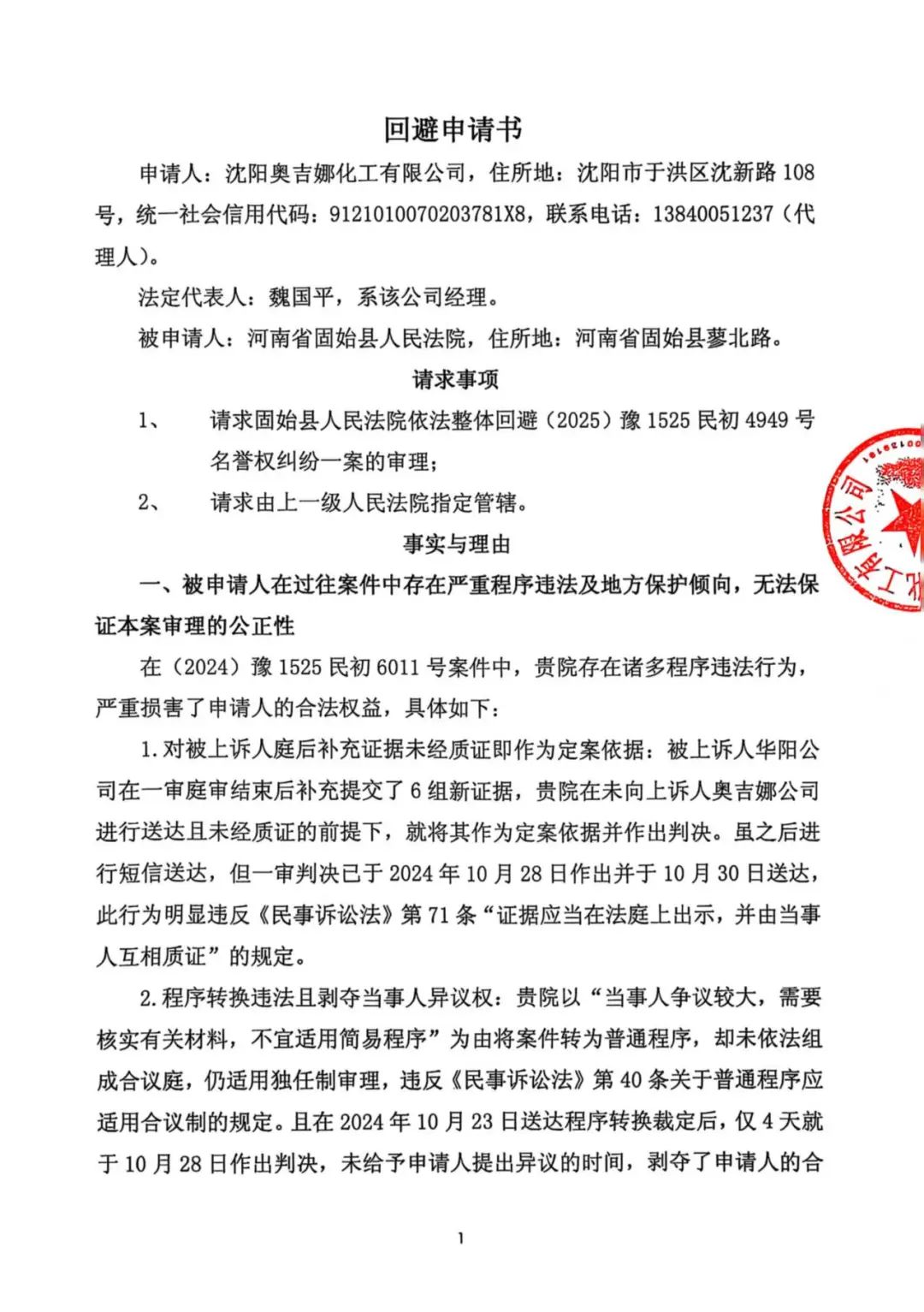 基于固始縣法院在原一審判決中存在嚴(yán)重違法行為及地方保護(hù)傾向,且奧吉娜公司已就原一審法官陳陽(yáng)在該案中的相關(guān)違法行為向固始縣法院等有關(guān)部門進(jìn)行舉報(bào),但固始縣法院至今沒有將處理結(jié)果告知奧吉娜公司,奧吉娜公司認(rèn)為固始縣法院無(wú)法保證該案在重新審理中的公正性,可能會(huì)繼續(xù)作出對(duì)奧吉娜公司不利的判決,奧吉娜公司于2025年6月16日依法向固始縣法院寄遞《回避申請(qǐng)書》,請(qǐng)求固始縣法院依法整體回避該案審理?。ㄏ赂健痘乇苌暾?qǐng)書》、案由和案件過(guò)程簡(jiǎn)述)