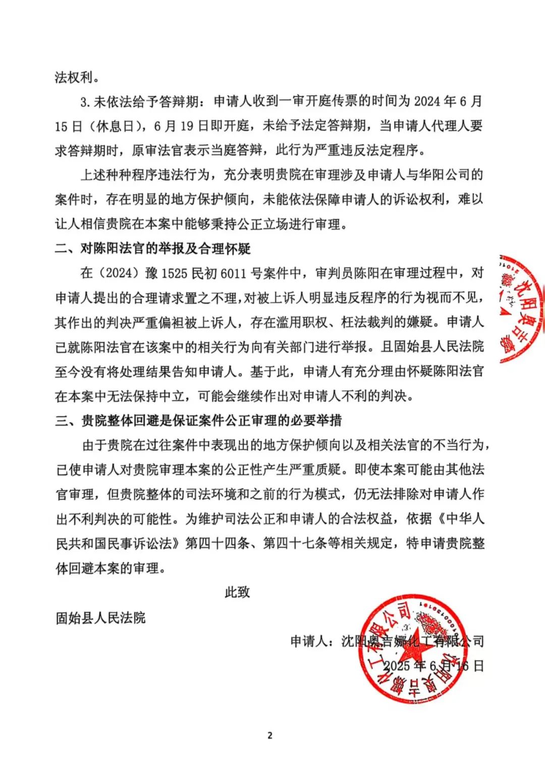 11、2025年6月13日,奧吉娜公司收到固始縣法院2025年7月4日開庭傳票。2025年6月16日,奧吉娜公司以郵寄方式向固始縣法院遞交《回避申請(qǐng)書》,請(qǐng)求固始縣法院依法整體回避(2025)豫1525民初4949號(hào)名譽(yù)權(quán)糾紛一案的審理。