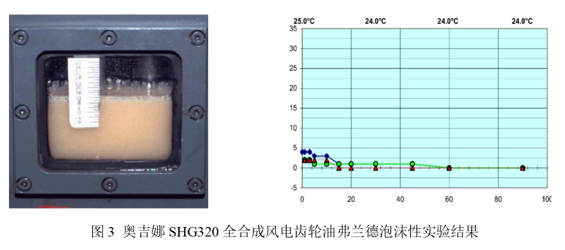 依據(jù)Flender(弗蘭德)泡沫性試驗GG-V425的試驗要求,對奧吉娜全合成風電齒輪油SHG320進行了泡沫性評價(實驗結(jié)果見圖3),在整個實驗過程中,形成的泡沫量不到5%,遠遠小于Flender試驗要求的15%,抗泡沫性能優(yōu)越。同時消泡劑的特殊結(jié)構(gòu)也減少了過濾設備對它的吸附,使得使用過程中損耗減小,完全滿足了風電齒輪油長壽命的要求。