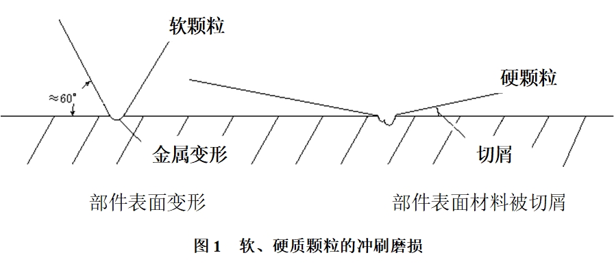 “沖蝕”磨損是指污染顆粒隨著高速流動的油液,不斷向油液系統(tǒng)中部件的表面吹射沖刷,使被沖刷部位受到磨損。污染顆粒有軟硬之分,軟質(zhì)顆粒的沖蝕磨損使被沖擊部件表面變形,在表層下產(chǎn)生缺陷后損壞。硬質(zhì)顆粒的沖蝕磨損使被沖刷部件表面材料晶格錯位、滑移,加劇部件疲勞或使材料表面直接被切屑剝離而形成嚴重磨損。如圖1所示。