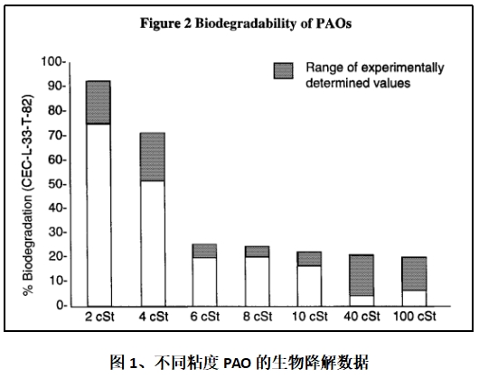 隨著海上風(fēng)電機(jī)組向大功率機(jī)型發(fā)展,風(fēng)機(jī)變速箱的用油量也隨之增加。目前風(fēng)電機(jī)組用變速箱齒輪油多為PAO型(聚α-烯烴)合成油,其生物降解能力有限,有數(shù)據(jù)表明,風(fēng)機(jī)齒輪油中的高粘度PAO其生物降解率小于20%(見圖1),一旦齒輪油發(fā)生傾瀉或以其它形式進(jìn)入海洋環(huán)境中,會對周圍的水域造成嚴(yán)重威脅和不同程度的破壞,直接影響海洋生態(tài)中的動植物。因此,提高風(fēng)電機(jī)組變速箱齒輪油的生物降解性對于海上風(fēng)力發(fā)電機(jī)組來說有著非常重要的意義。