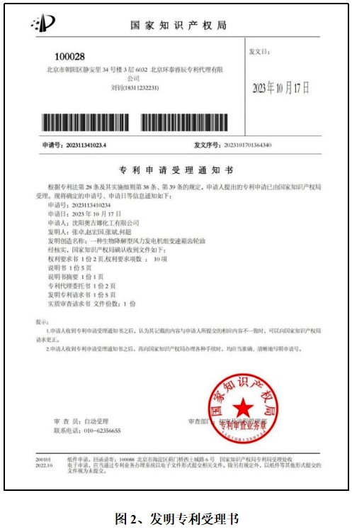 奧吉娜在國內(nèi)首先提出生物降解型風(fēng)力發(fā)電機(jī)組變速箱齒輪油,并已成功研究生產(chǎn)出相關(guān)產(chǎn)品,該產(chǎn)品的相關(guān)技術(shù)數(shù)據(jù)已向國家知識產(chǎn)權(quán)總局申請了該領(lǐng)域的發(fā)明專利(見圖2)。
